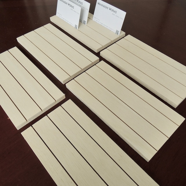 ピアススタンド、コレクションカード、台紙カードのスタンド陳列に ひとつひとつ手作りしているアクセサリーディスプレイ *複数点数あるため、写真最後より材種を選べます 〈サイズ等〉 写真 :最後の写真にて「材ナンバー」を選んでください 在庫の有無は画面下部「種類を選択する」にて確認頂けます 商品名:「ピアススタンド 3連溝/長18」 個数 :6個 色 :無塗装のみ 素材 :普通合板 サイズ:横18cm、縦9cm、厚9mm、溝1.6mm、深さ約4〜4.5mm 傾斜 :溝角度5度(名刺75度) 配送 :クリックポスト 追加分: ・他什器との購入時は同梱包のため追加送料がかかりません。 風が吹いても前に倒れず、自動で元の位置に戻る、微妙な角度と激細の溝カットをしています 〈特徴〉 ・大きめのため台座が転倒する心配ありません ・溝に僅かな角度があり前傾しても元の位置に戻る ・角度があるためアクセ加重で垂れにくい ・厚手カード、クレカや交通系のカードの展示も大丈夫 ・背面側にスタンプ印があり前後方向を確認可能 ・無塗装のため塗装剥がしが不要で塗装や接着が可能 ・装飾のない直角カットのため自然に連結できます 〈発送〉 当品は製作済みの在庫品になります。ご注文後、翌営業日(平日)に発送しています ーー*カードスタンド種類*ーーーー ・3連の溝入り:縦置き9枚、横置き6枚 ・正方形1枚用:POP値札シールスペースあり アクセサリディスプレイ:https://waninashi.base.shop/categories/6071876 ーー*アクセサリーディスプレイ種類*ーーーー ・5段棚ひな壇前後陳列、角地に https://waninashi.base.shop/items/91962410 ・5段棚スリム型、細テーブルに https://waninashi.base.shop/items/82520996 ・3段棚50cm幅、4段陳列可能 https://waninashi.base.shop/items/84504752 ・小箱や小物カード横サイズ6段 https://waninashi.base.shop/items/97950544 ・木箱傾斜台、食品・宝飾陳列に https://waninashi.base.shop/items/93838416 ・傾斜パネル、花リース・アクセに https://waninashi.base.shop/items/96527998 ・ピアススタンド3連溝、カード立てに https://waninashi.base.shop/items/88937050 ーー*関連ブログ*ーーーー ・自動で戻るピアススタンド https://waninashi.base.shop/blog/2025/01/10/131022 ーー*カスタム*ーーーー ・塗装とコツ:https://waninashi.base.shop/p/00001 WANINASHI WORKS 複製・類似品製作禁止