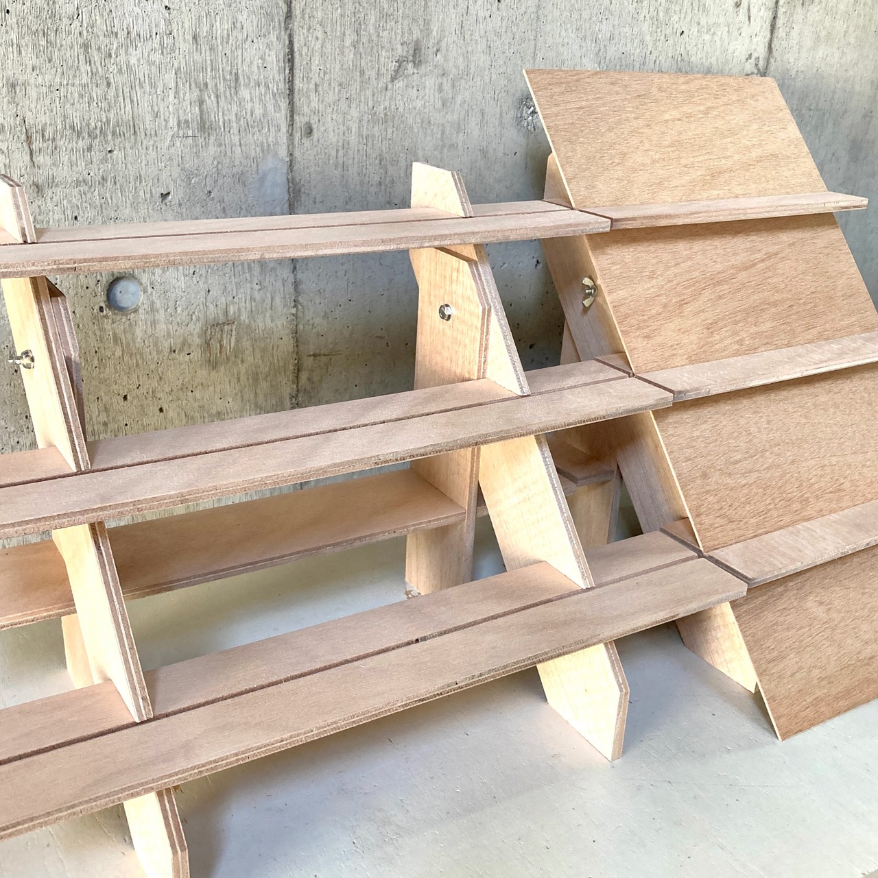 イベント出店等にて手持ち搬入の方向けに簡単に解体・組み立てができる棚の製作を行っています。解体すると50cmの板8枚と蝶ネジ2セットのみと非常に小さくなります。