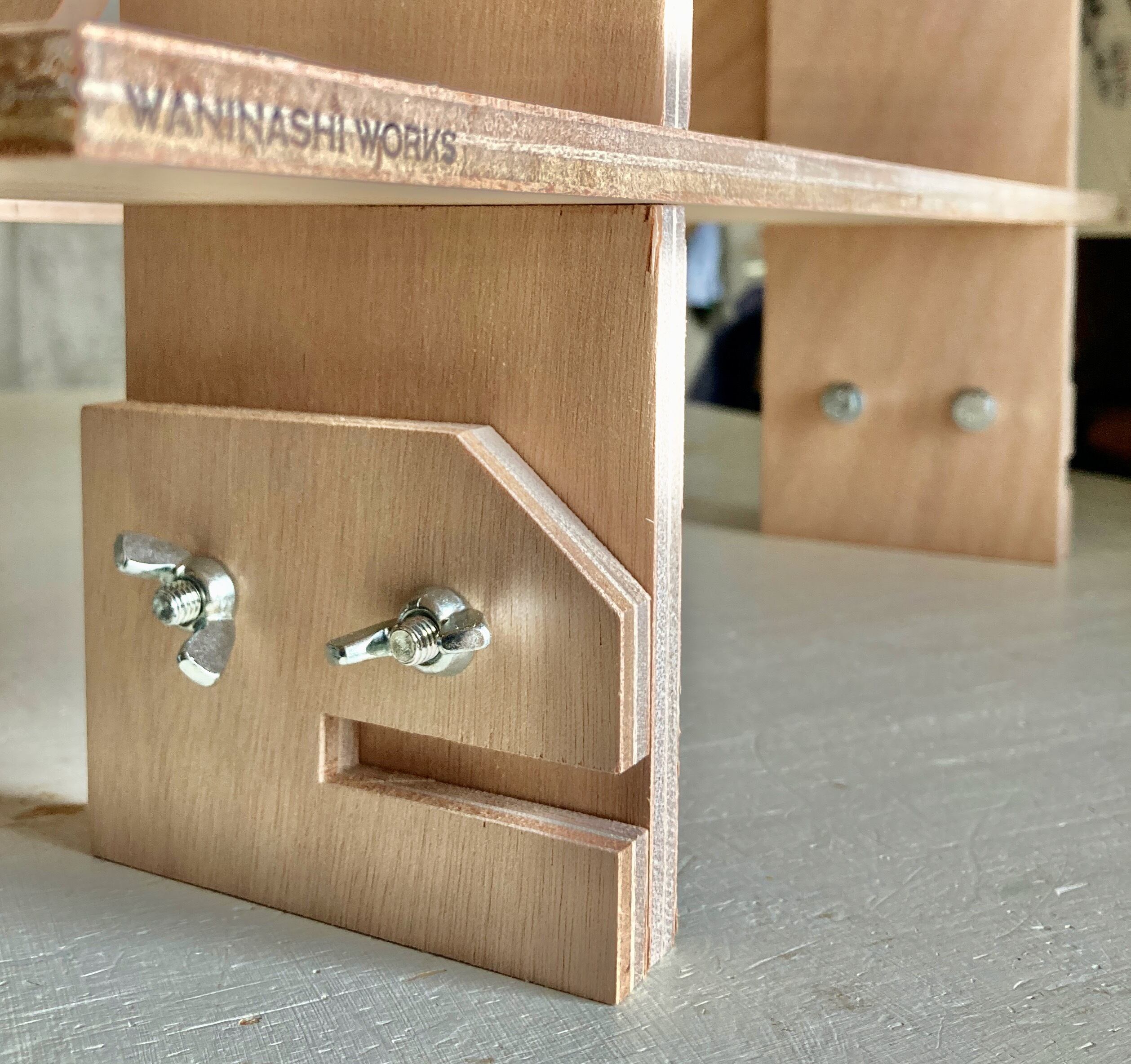 イベント出店等にて手持ち搬入の方向けに簡単に解体・組み立てができる棚の製作を行っています。解体すると50cmの板8枚と蝶ネジ2セットのみと非常に小さくなります。