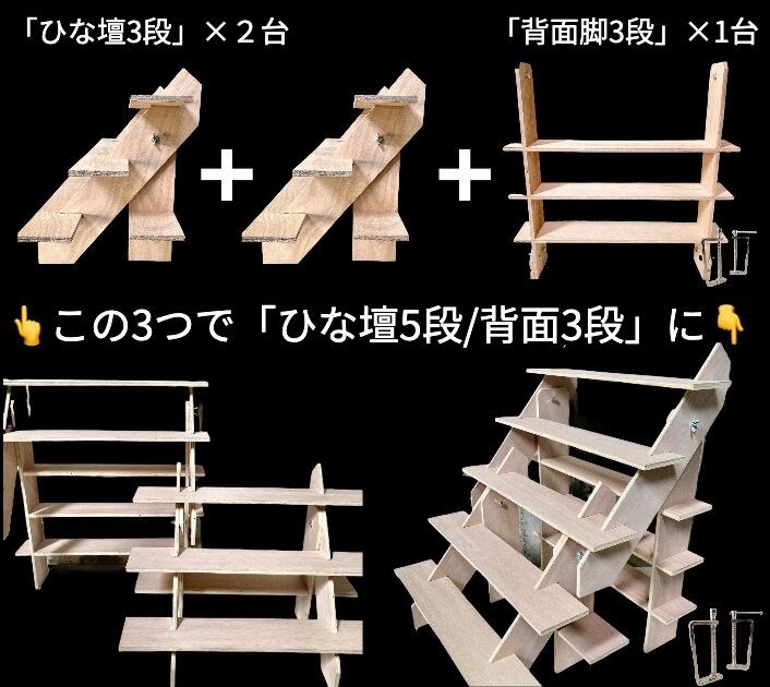 「ひな壇3段」×2台+「背面脚3段」で5段化(テーブル段含め6段陳列)できます。